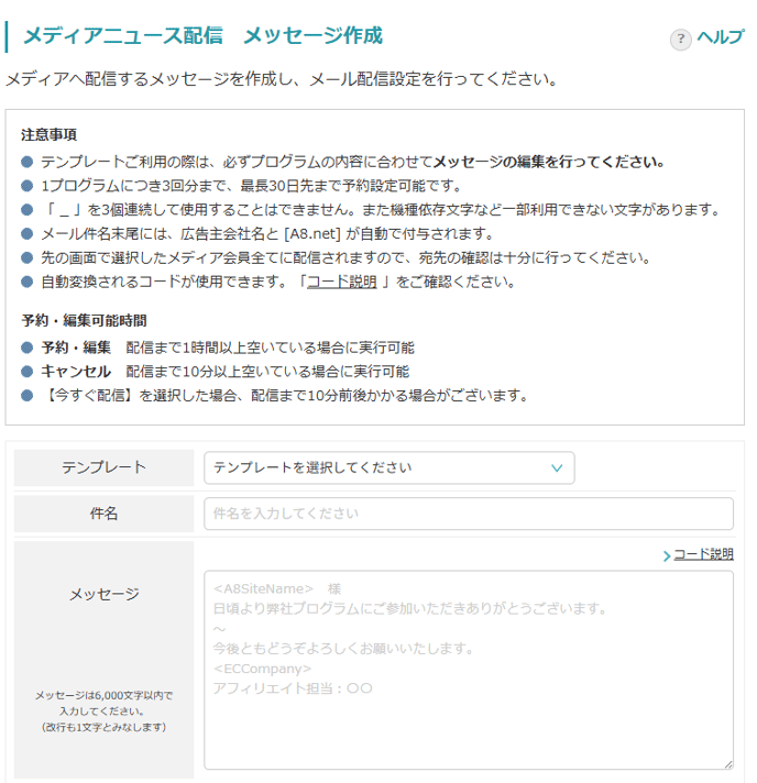 メディアへ配信された際、件名末尾には広告主名と [A8.net] が自動で付与されます。 |
