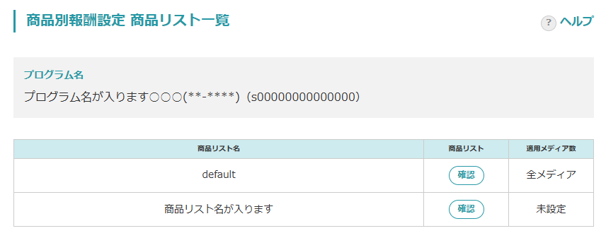 商品別報酬設定では、商品別の成果報酬の設定やメディア別の設定を確認をすることができます。