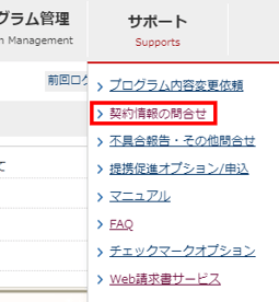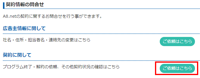 A8.net管理画面のTOPページのサポート>契約情報の問合せをクリック。