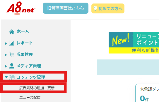 ①管理画面内「コンテンツ管理」>「広告素材の追加更新」をクリックします。