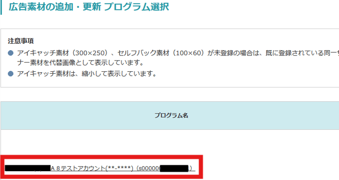 ※セルフバック素材、アイキャッチ素材を登録するには、プログラム選択の画面から登録・編集画面を開いてください。